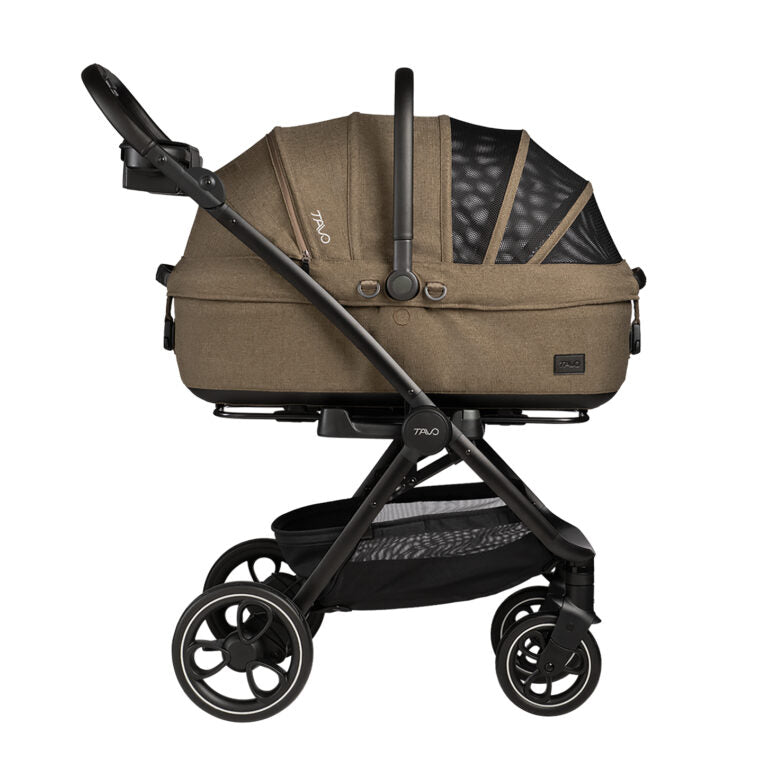 Komfort a pohodlí na cestách - Odpružení všech kol a jejich větší průměr zaručují plynulou jízdu i na méně upraveném povrchu. Kola jsou vyrobena z odolného, bezdušového EVA materiálu, který tlumí nerovnosti a zároveň je tichý při jízdě po tvrdém povrchu. Ergonomická rukojeť s luxusními veganskými koženými detaily nabízí pohodlné držení a je doplněna praktickým organizérem – ideálním pro pamlsky, vodítko, láhev s vodou nebo drobnosti, které chcete mít po ruce.