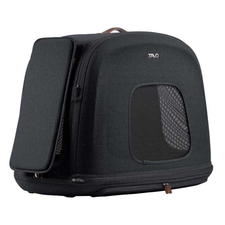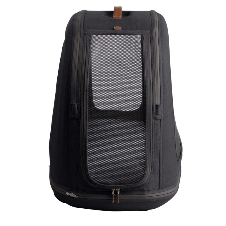Přístup do přepravky zajišťují zipové vstupy z obou stran, které usnadňují manipulaci se zvířetem. Prémiové detaily z veganské kůže podtrhují elegantní vzhled produktu.